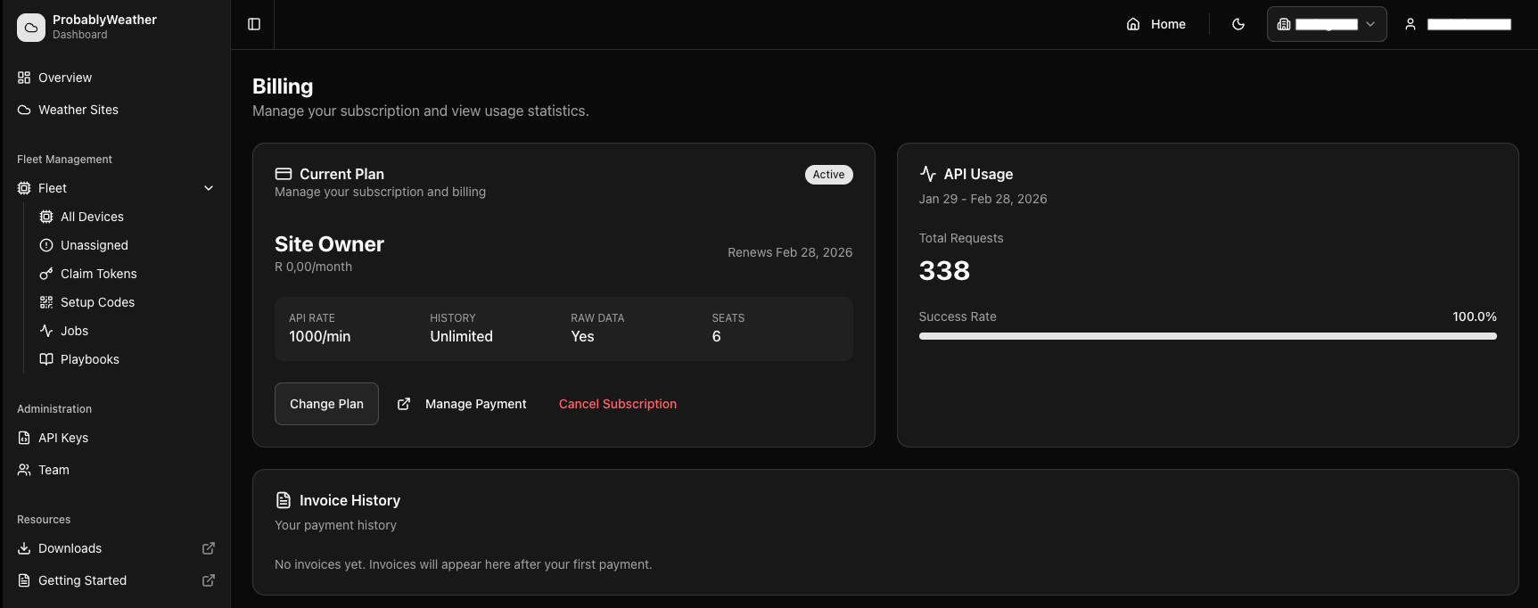 B2B billing with subscription plan, API usage stats, and invoice history