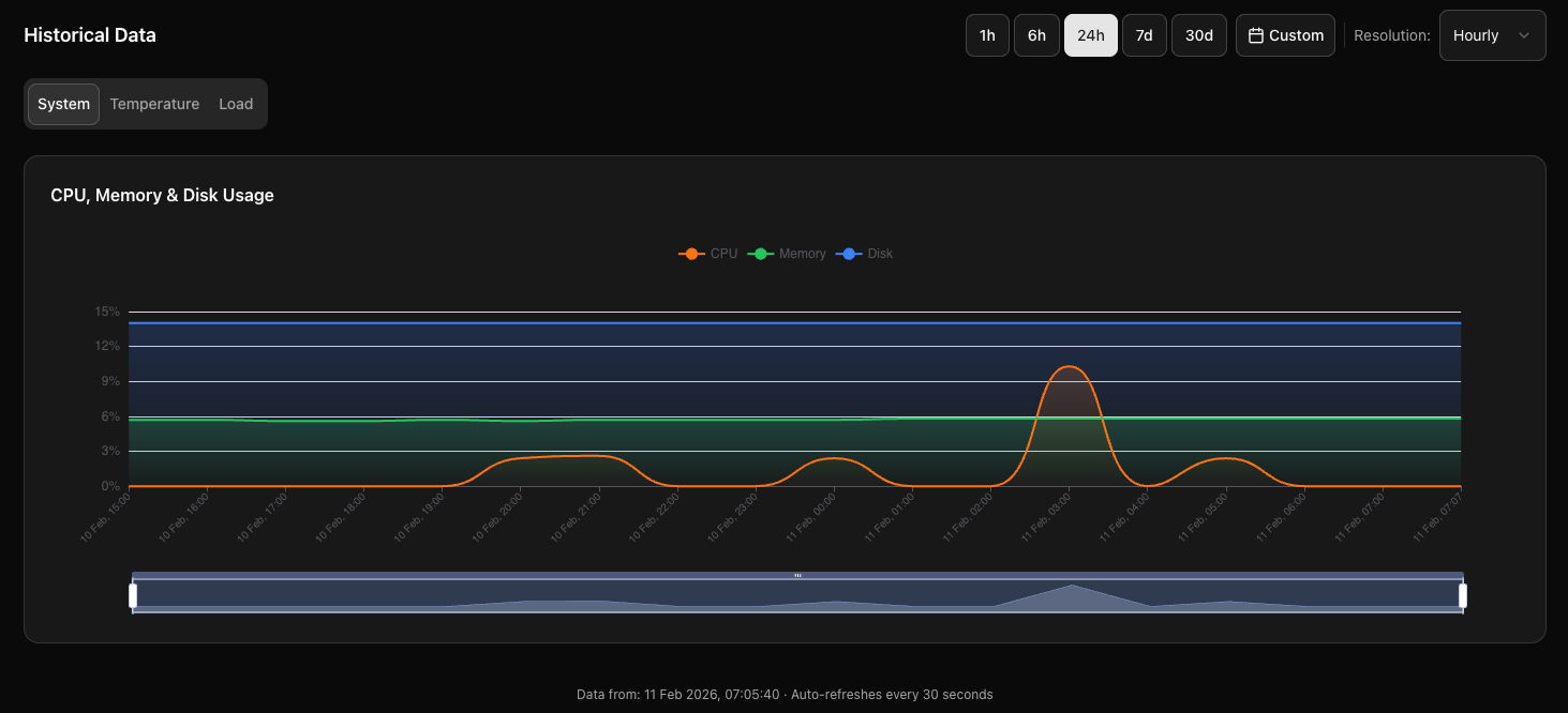 Device resource usage charts with CPU, memory, and disk over time