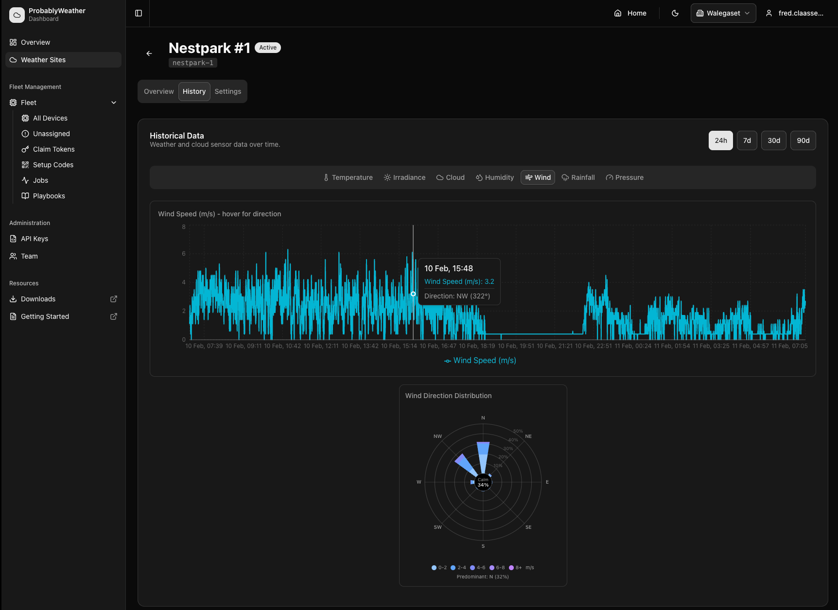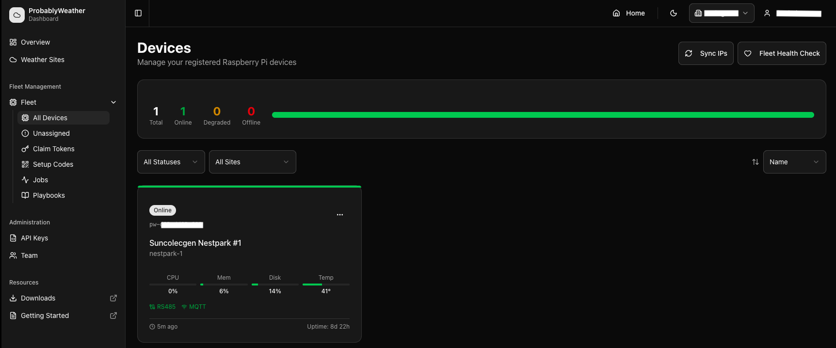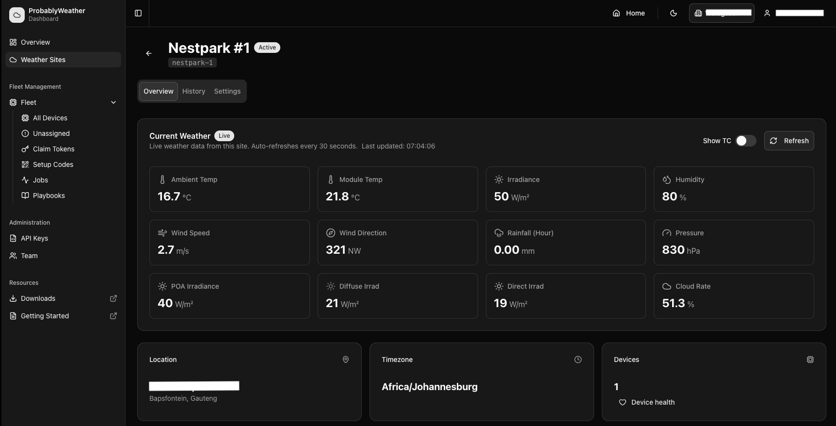 Probably Weather is a full-stack IoT weather monitoring platform purpose-built for solar installation sites. Raspberry Pi field stations equipped with industrial-grade Seven Sensor compact weather stations collect 30-second readings of solar irradiance, temperature, humidity, air pressure, rainfall, and wind data via Modbus RTU over RS-485.