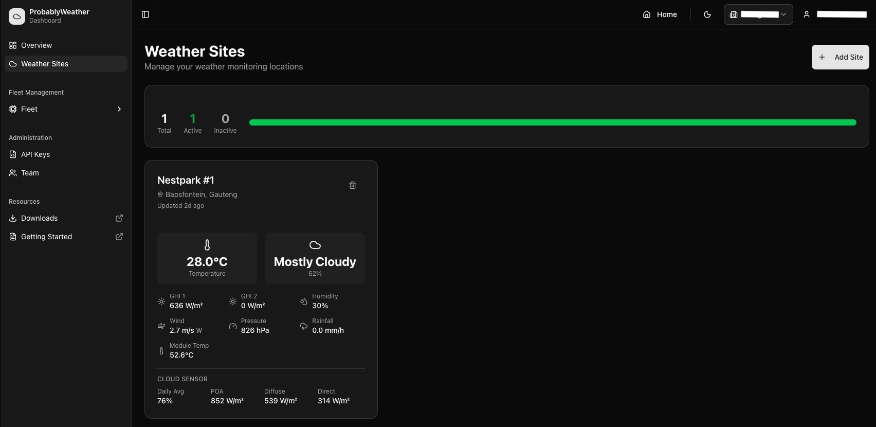 Weather sites list with live temperature, conditions, and sensor data