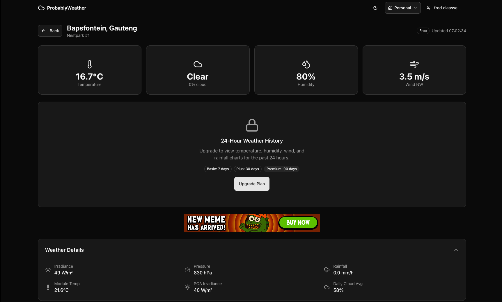 Public live weather view with current conditions, sensor readings, and map
