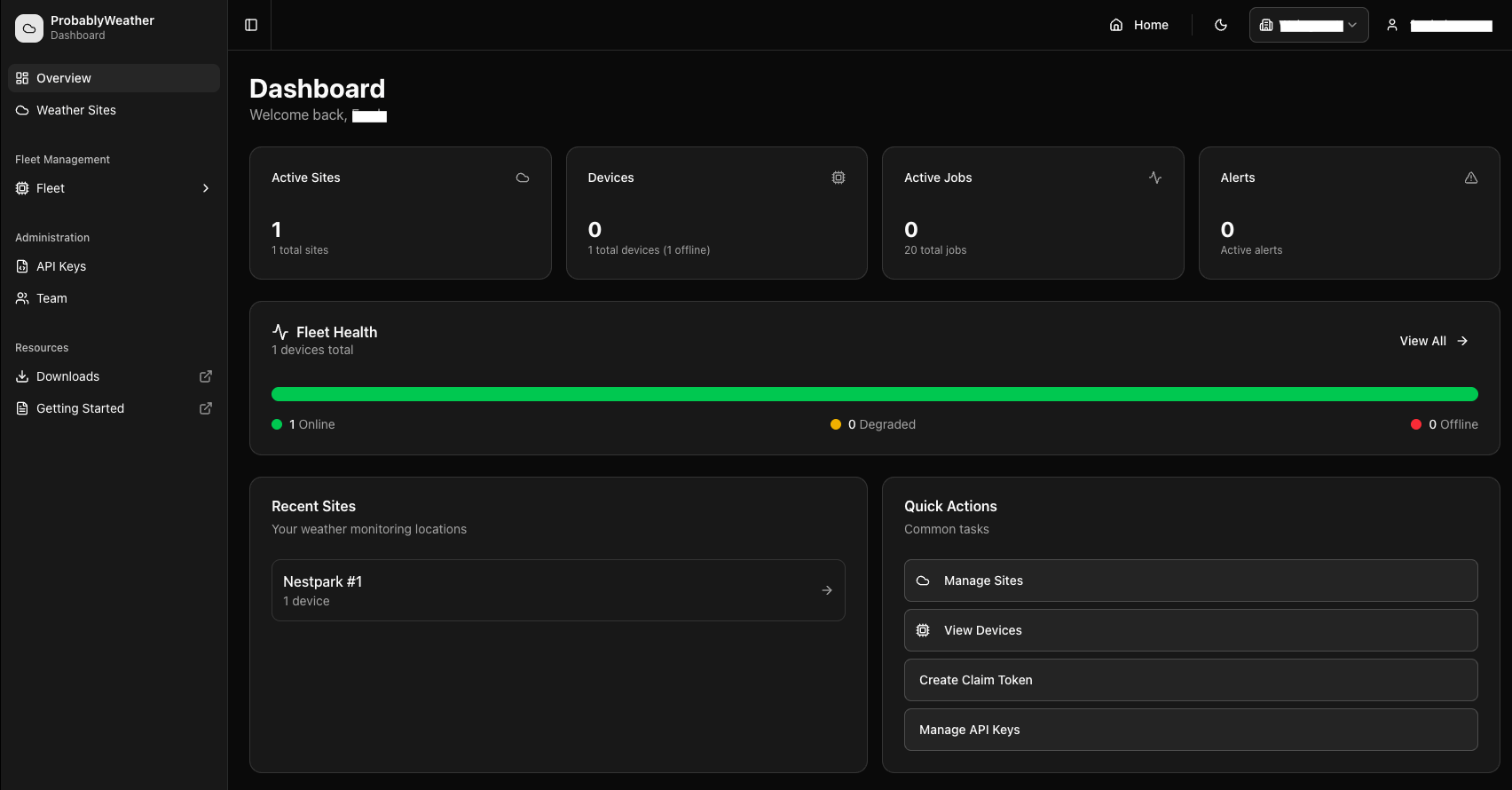 B2B dashboard with active sites, fleet health, devices, and quick actions